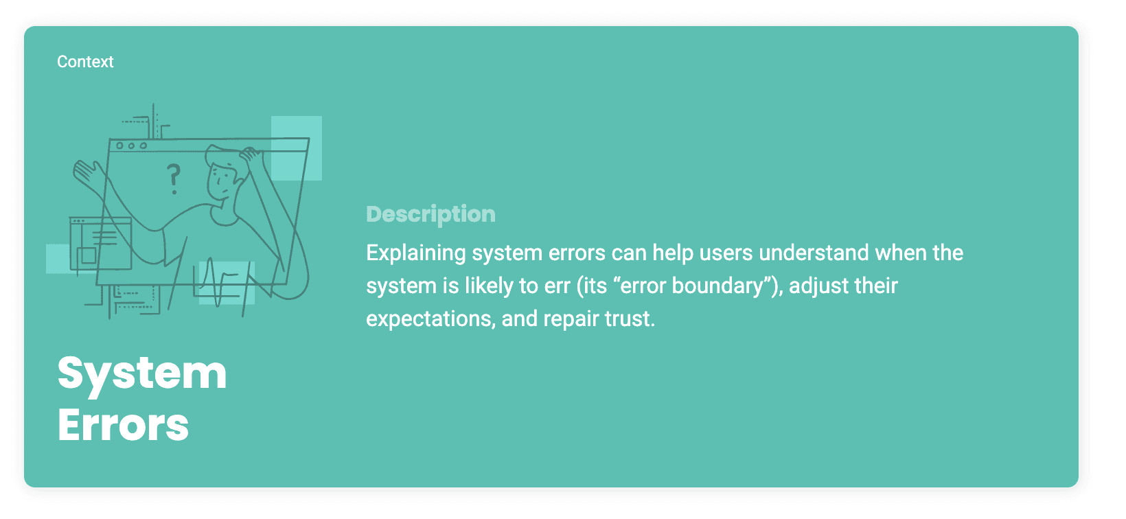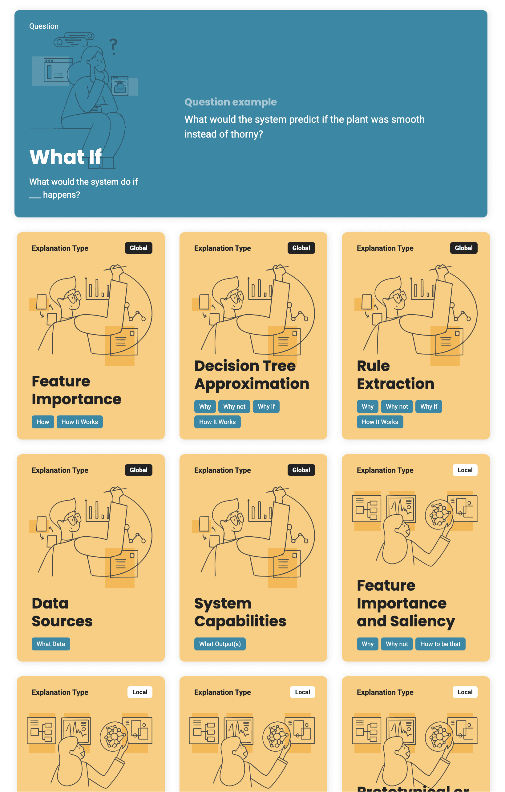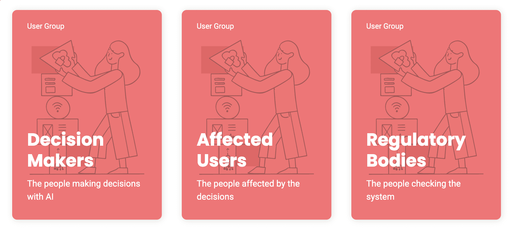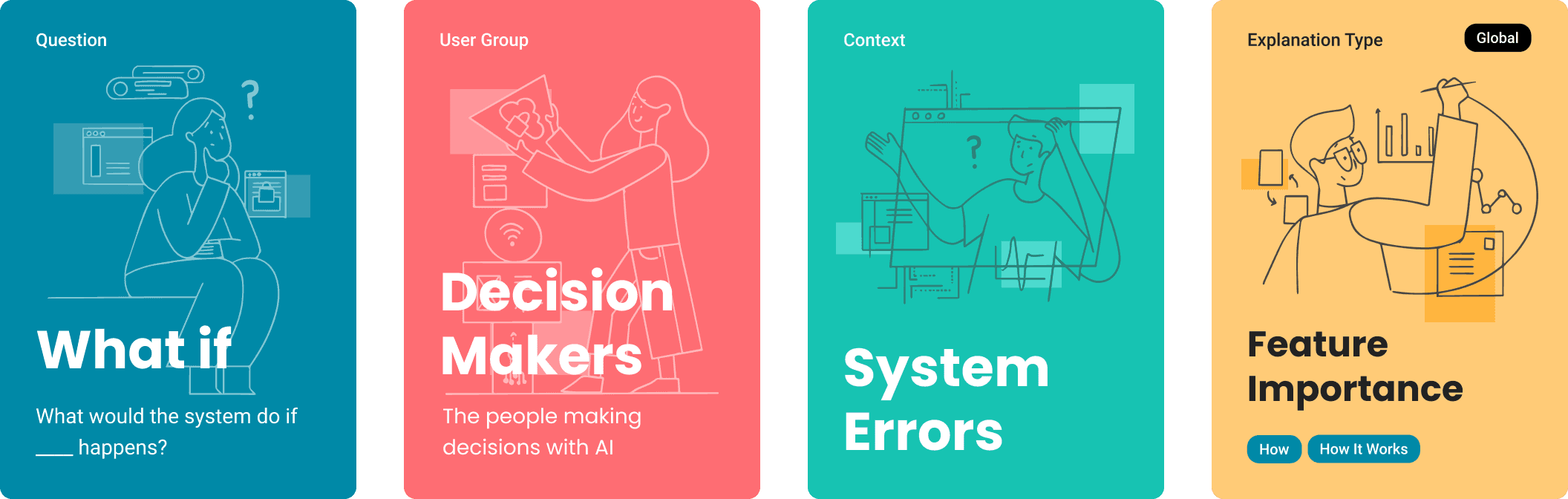 Card-based tools for product teams to use during design sessions. Prompts and frameworks for thinking through AI transparency without needing ML expertise. Low barrier to entry for teams new to AI product development.